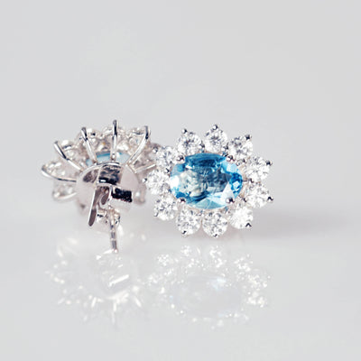 Oval aquamarine and brilliant cut diamond cluster earrings, set in 18ct white gold.